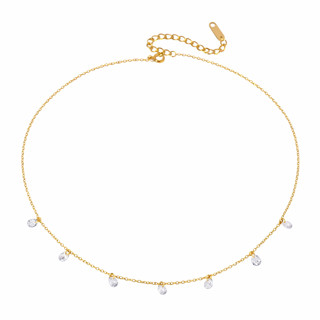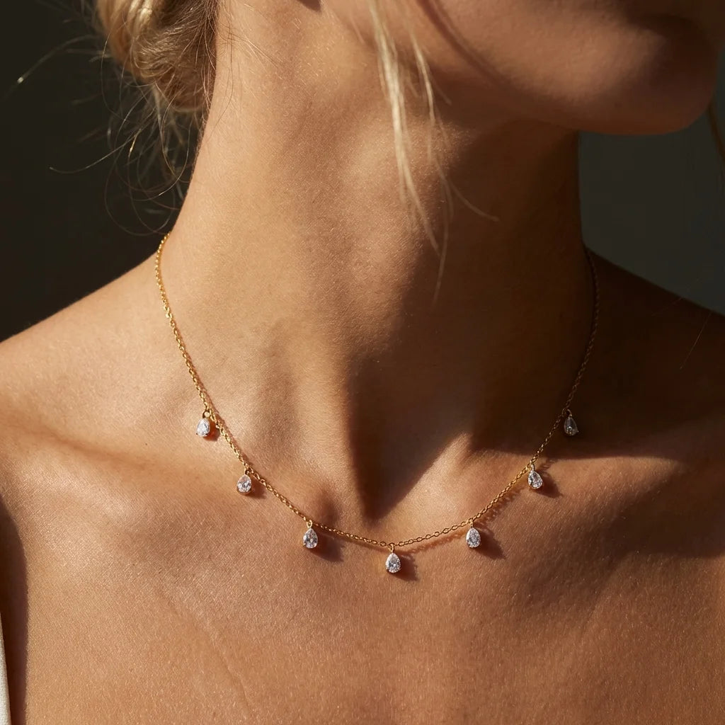 Designed with fine gold chain and evenly spaced teardrop crystals, this piece reflects light with every subtle movement. Each drop adds a soft shimmer, creating a look that feels fresh, minimal, and quietly elegant.