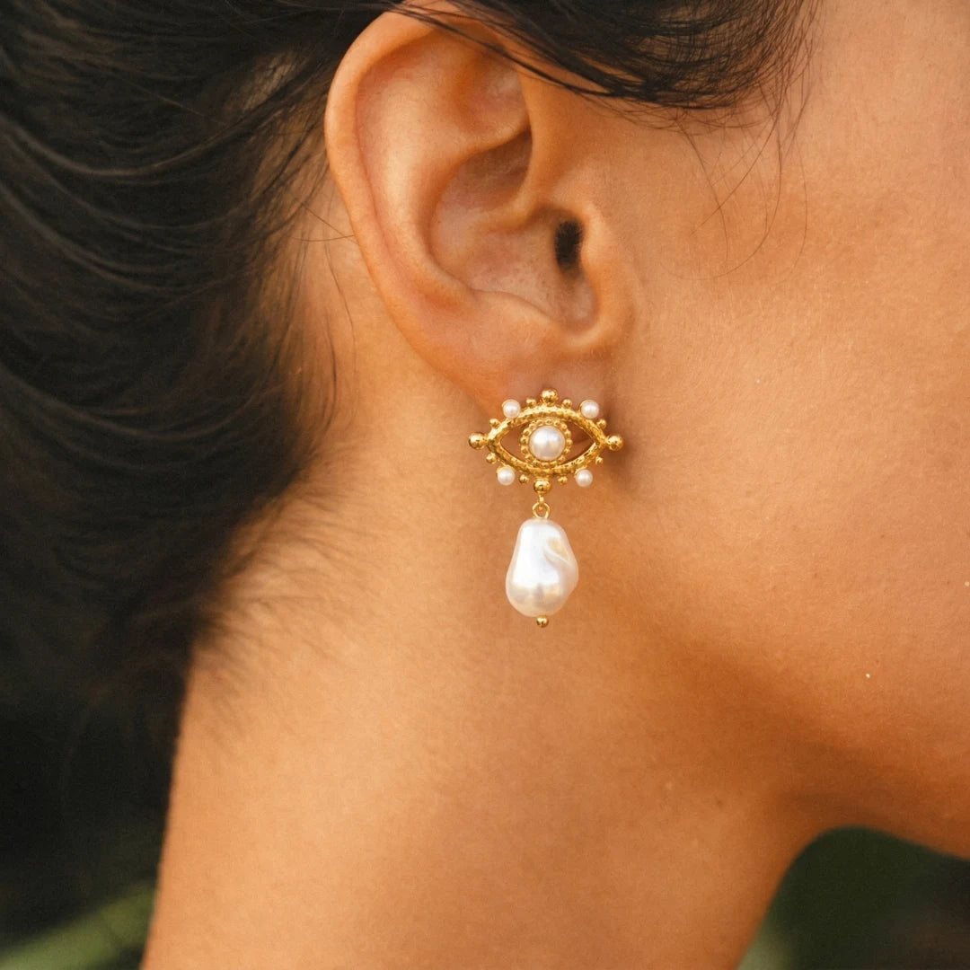 Soft elegance meets subtle protection — the Priskel Pearl Nazar Drop Earrings are designed to feel both beautiful and meaningful.