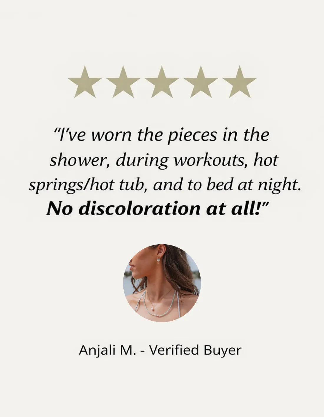 Our jewellery isย 100% waterproofย so you can do your daily routineย without having to take it off!ย You can wear your jewelleryย in the shower, in the pool, to the gym, and at the beach,ย they will neverย tarnish! โจ