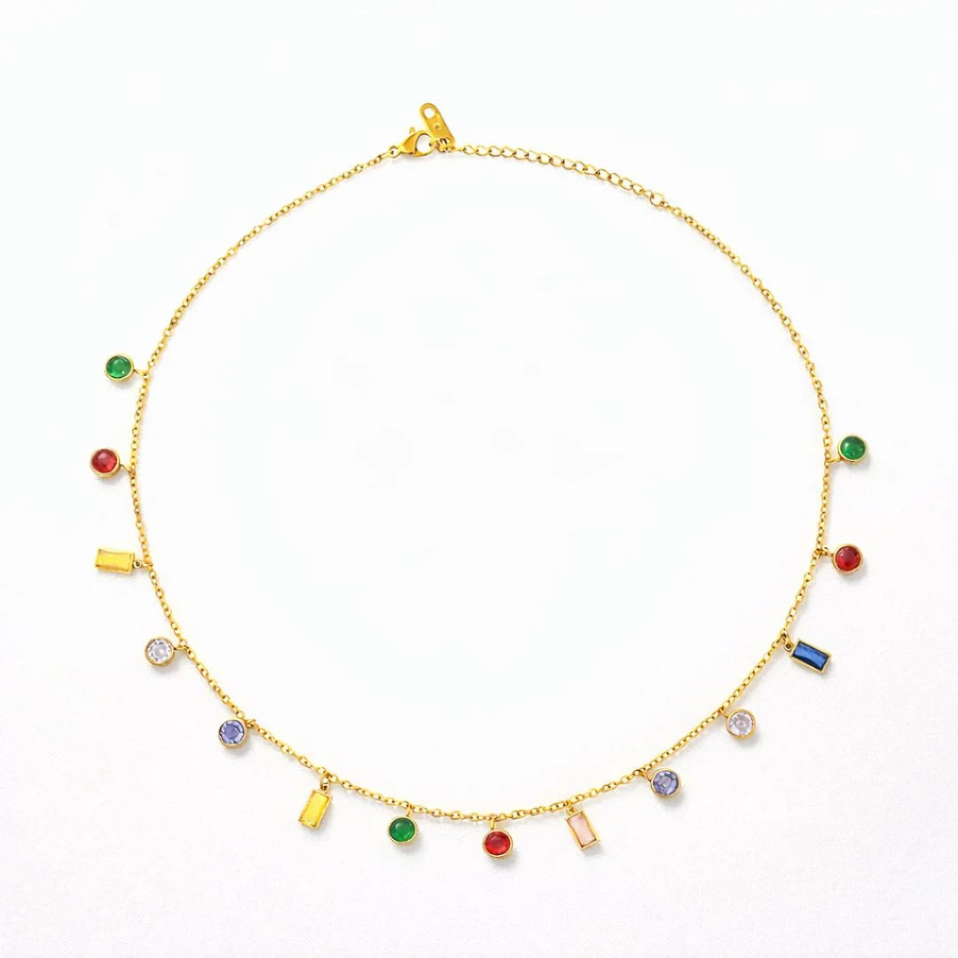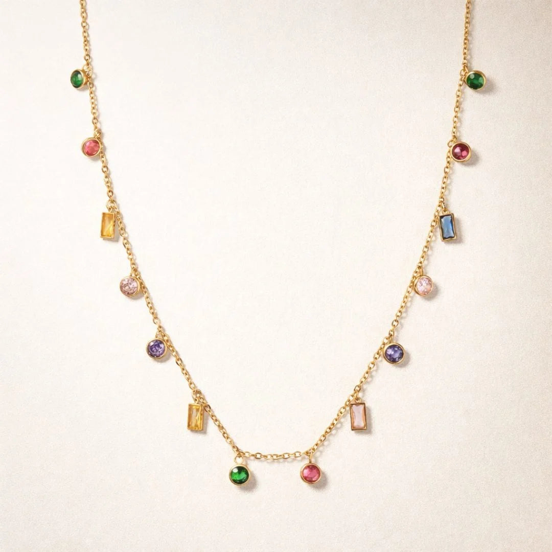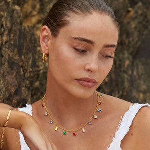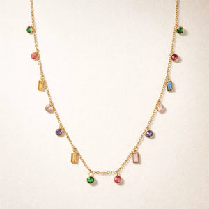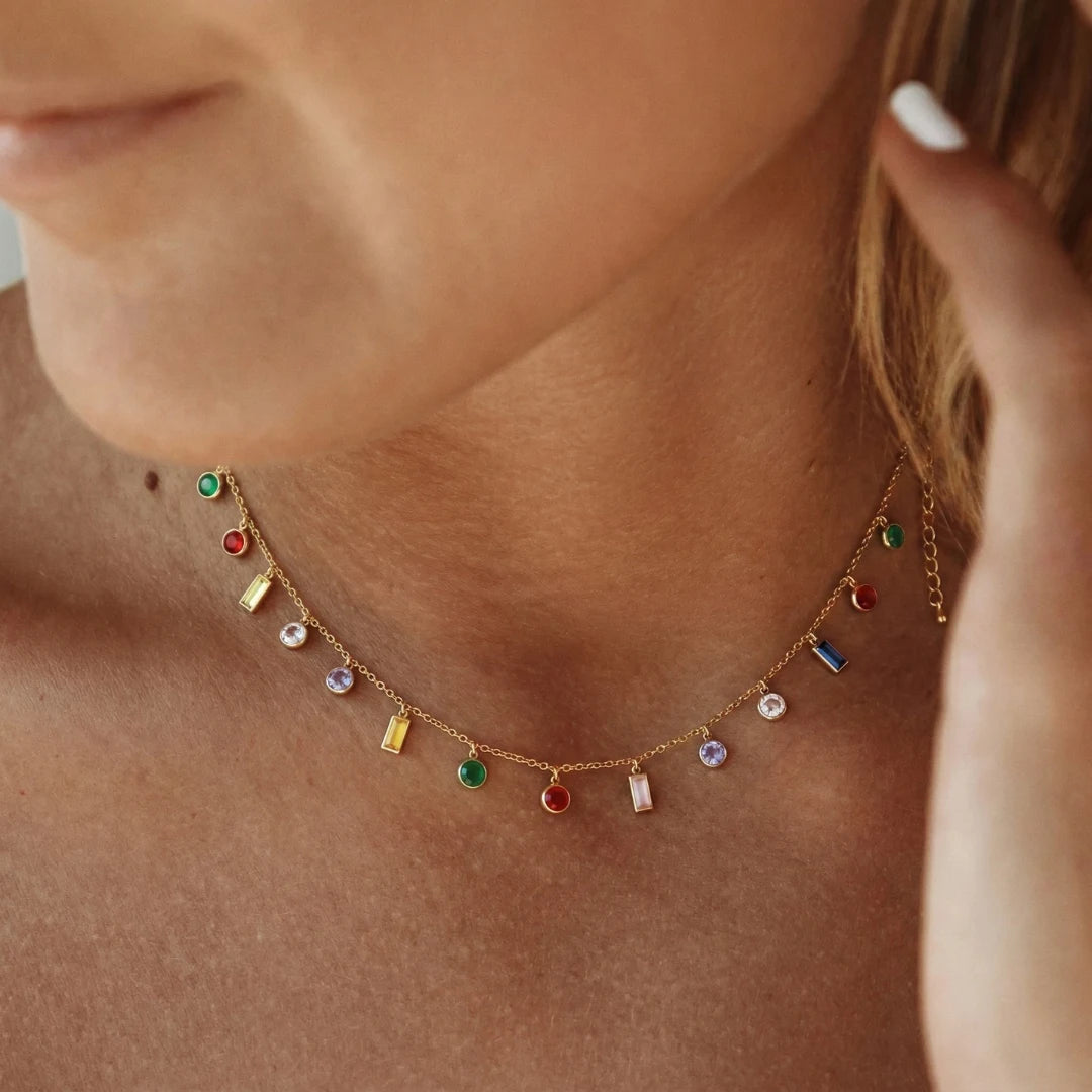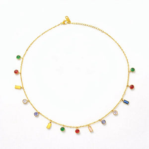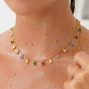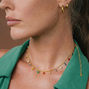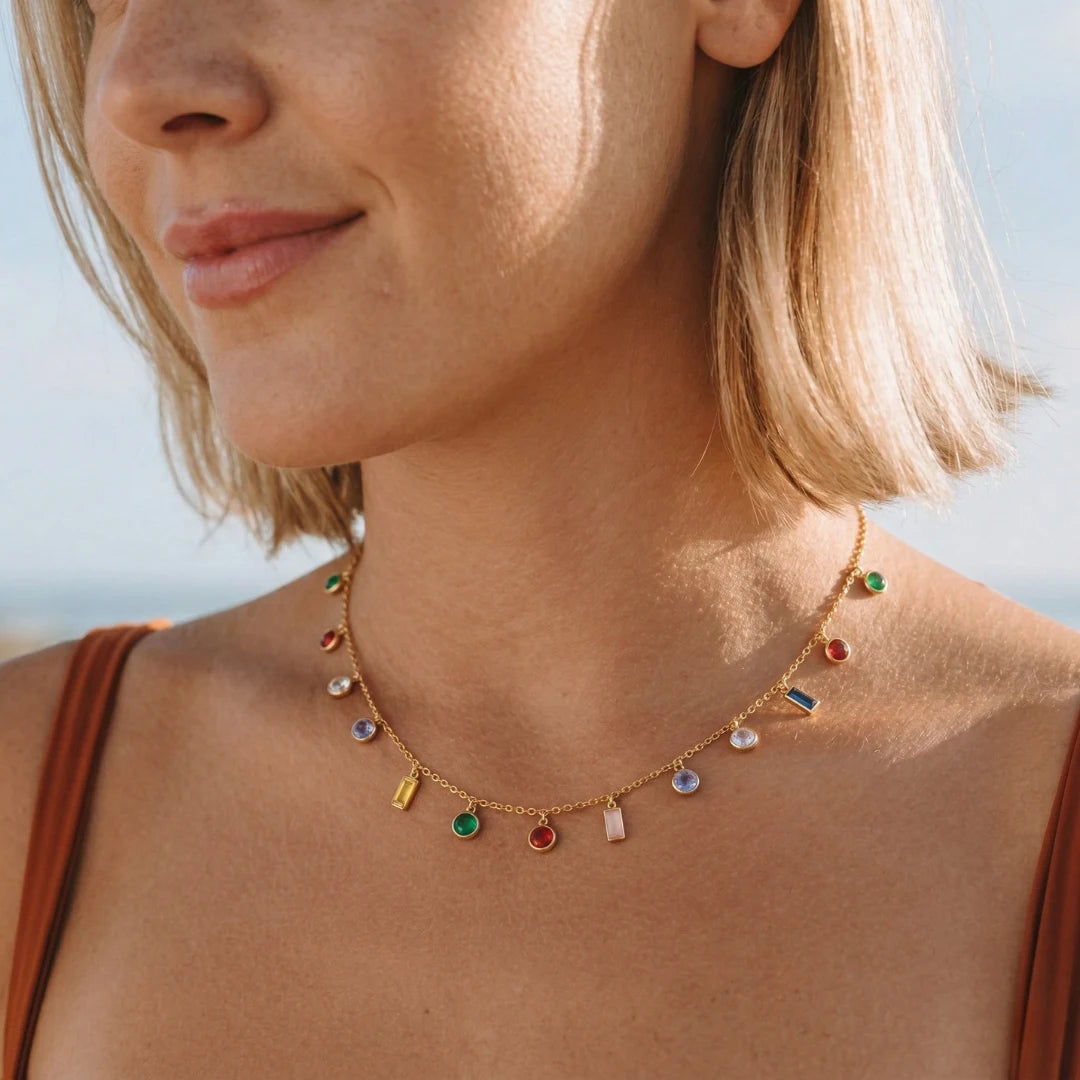 Step into a world of color with our Rainbow Dainty Multi-Charm Necklace. Like a little celebration around your neckline, this piece brings together vibrant gemstone charms on a delicate gold chain - playful, radiant, and effortlessly feminine.